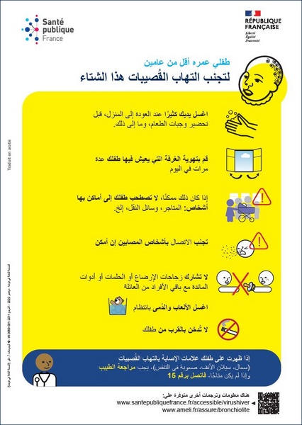 Comment éviter la bronchiolite pour les enfants de moins de 2 ans ? Affiche imagée élaborée avec des professionnels intervenant auprès de personnes vulnérables. Texte en arabe.
