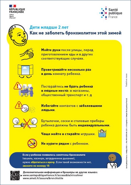 Comment éviter la bronchiolite pour les enfants de moins de 2 ans ? Affiche imagée élaborée avec des professionnels intervenant auprès de personnes vulnérables. Texte en russe.