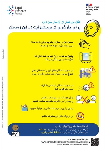 Comment éviter la bronchiolite pour les enfants de moins de 2 ans ? Affiche imagée élaborée avec des professionnels intervenant auprès de personnes vulnérables. Texte en dari.