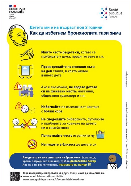 Comment éviter la bronchiolite pour les enfants de moins de 2 ans ? Affiche imagée élaborée avec des professionnels intervenant auprès de personnes vulnérables. Texte en bulgare.