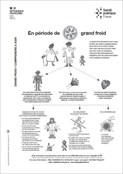 Cette affiche utilisable par tout type de professionnel de santé, par les associations, les mairies et tout lieu recevant du public vise à informer le grand public sur les risques liés au grand froid et propose d'adopter de bonnes pratiques pour mieux vivre les périodes de conditions météorologiques exceptionnelles.