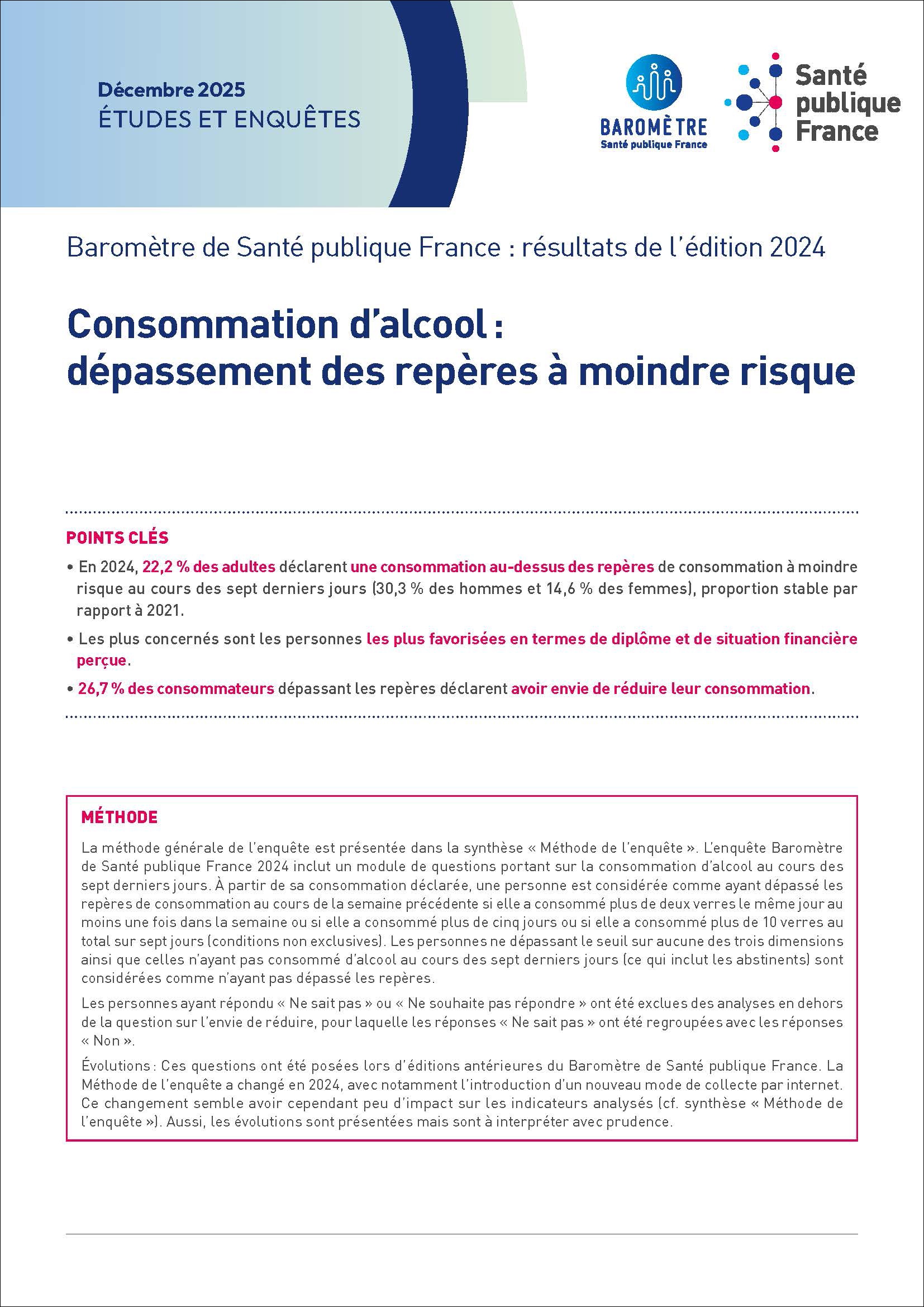 En 2024, 22,2 % des adultes déclarent une consommation au-dessus des repères de consommation à moindre risque au cours des sept derniers jours (30,3 % des hommes et 14,6 % des femmes), proportion stable par rapport à 2021. Les plus concernés sont les personnes les plus favorisées en termes de diplôme et de situation financière perçue. 26,7 % des consommateurs dépassant les repères déclarent avoir envie de réduire leur consommation.