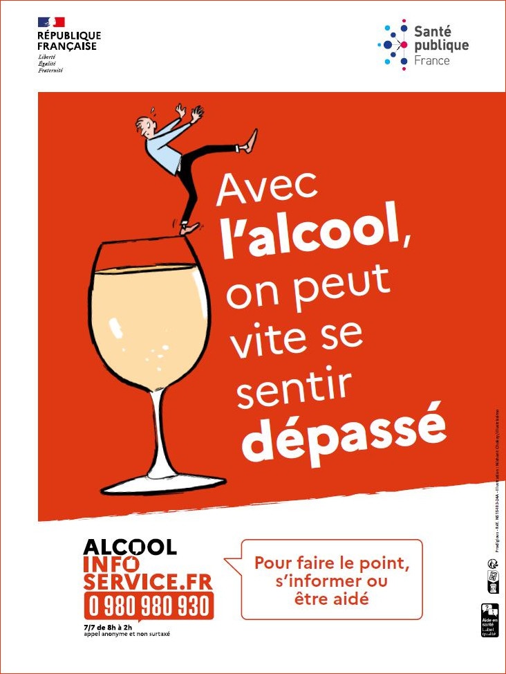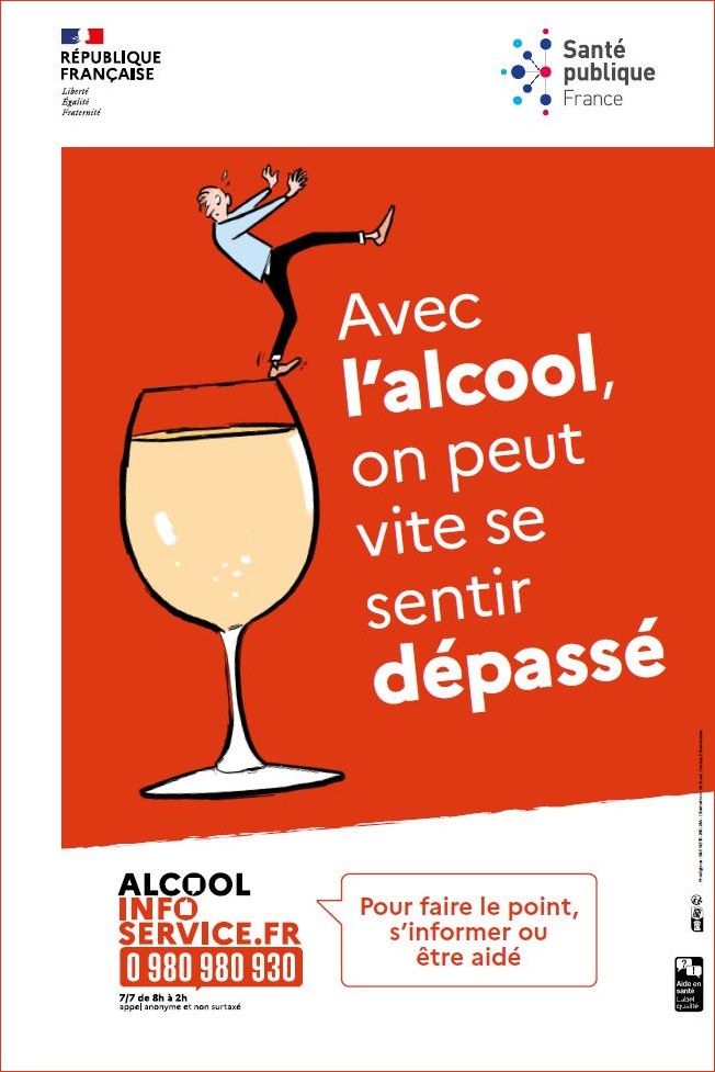 Affiche illustrée au format 30x40 cm faisant la promotion du dispositif d'aide à distance en santé Alcool info service. Accroche : "Avec l'alcool, on peut vite se sentir dépassé".