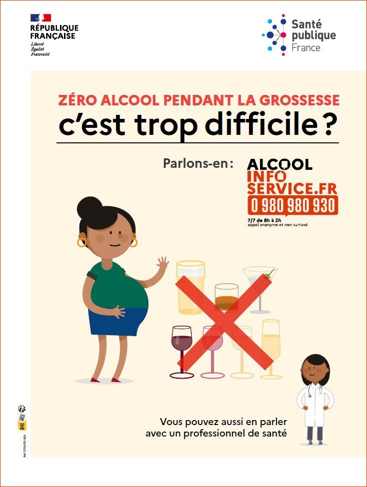 Affiche destinée consacrée à la consommation d'alcool pendant la grossesse. Elle renvoie vers les professionnels de santé (médecin ou sage-femme) ou alcool-info-service.fr...