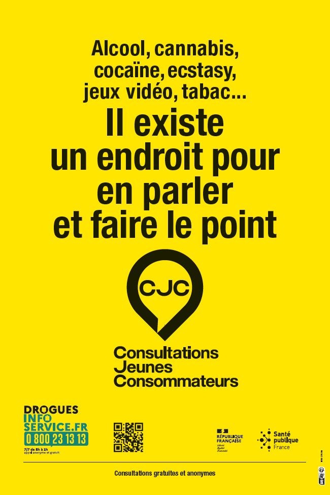 Affiche de promotion des CJC, Consultations Jeunes Consommateurs. Elle renvoie vers la ligne Drogues Info Service au 0 800 23 13 13 et le site correspondant. Elle laisse un encadré blanc pour...