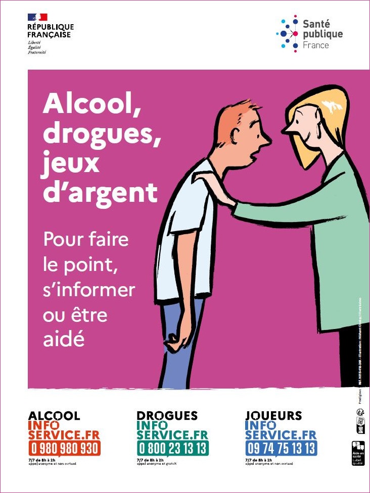 Affiche illustrée au format 30x40 cm faisant la promotion des dispositifs d'aide à distance en santé sur les addictions. Accroche : "Alcool, drogues, jeux d'argent : Pour faire...