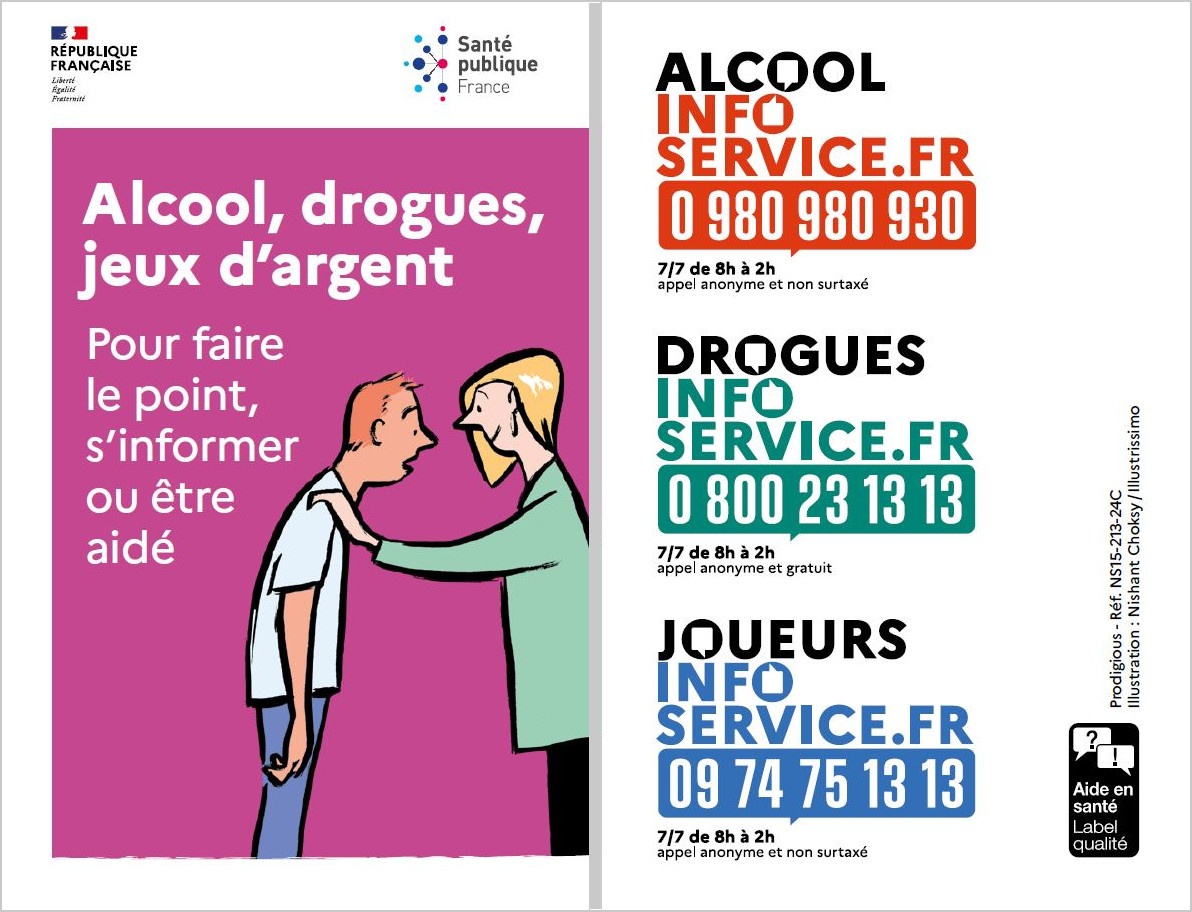 Carte illustrée au format 5,5x8,5 cm faisant la promotion des dispositifs d'aide à distance en santé sur les addictions. Accroche : "Alcool, drogues, jeux d'argent : Pour faire le point, s'informer ou être aidé". Coordonnées des dispositifs Alcool info service, Drogues info services, Joueurs info service.