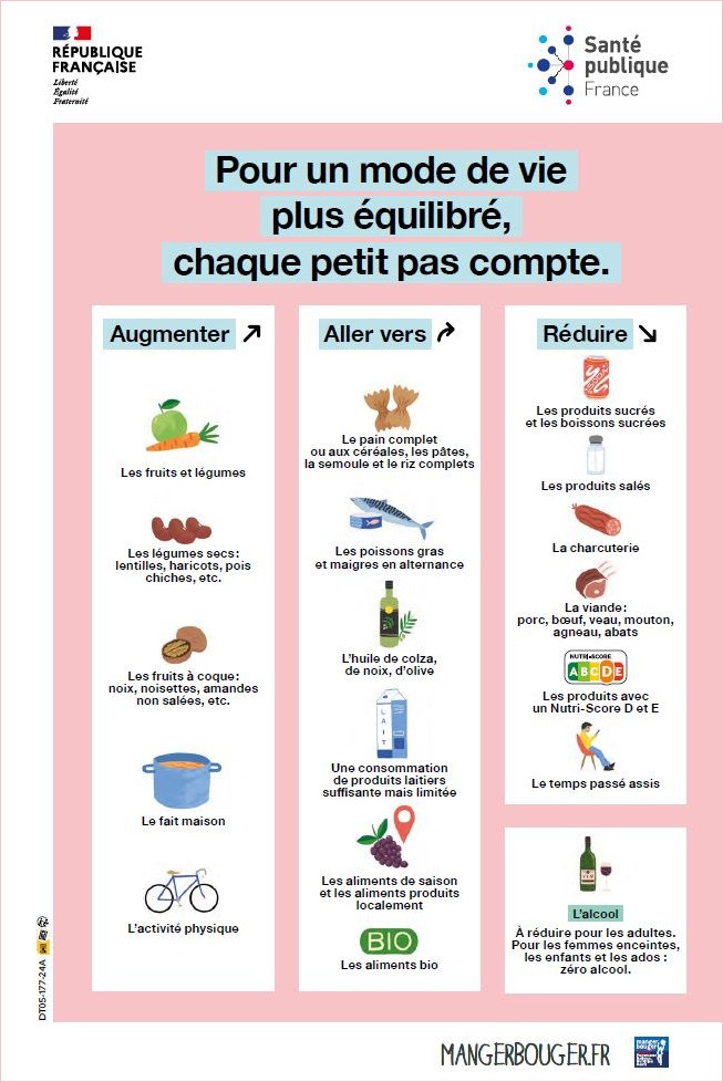 Cette affiche présente les nouvelles recommandations pour la population concernant l'alimentation, l'activité physique et la sédentarité. Elle invite le consommateur à modifier ses habitudes et ses choix, progressivement et à son rythme, autour de trois notions : Augmenter / Aller vers / Réduire.