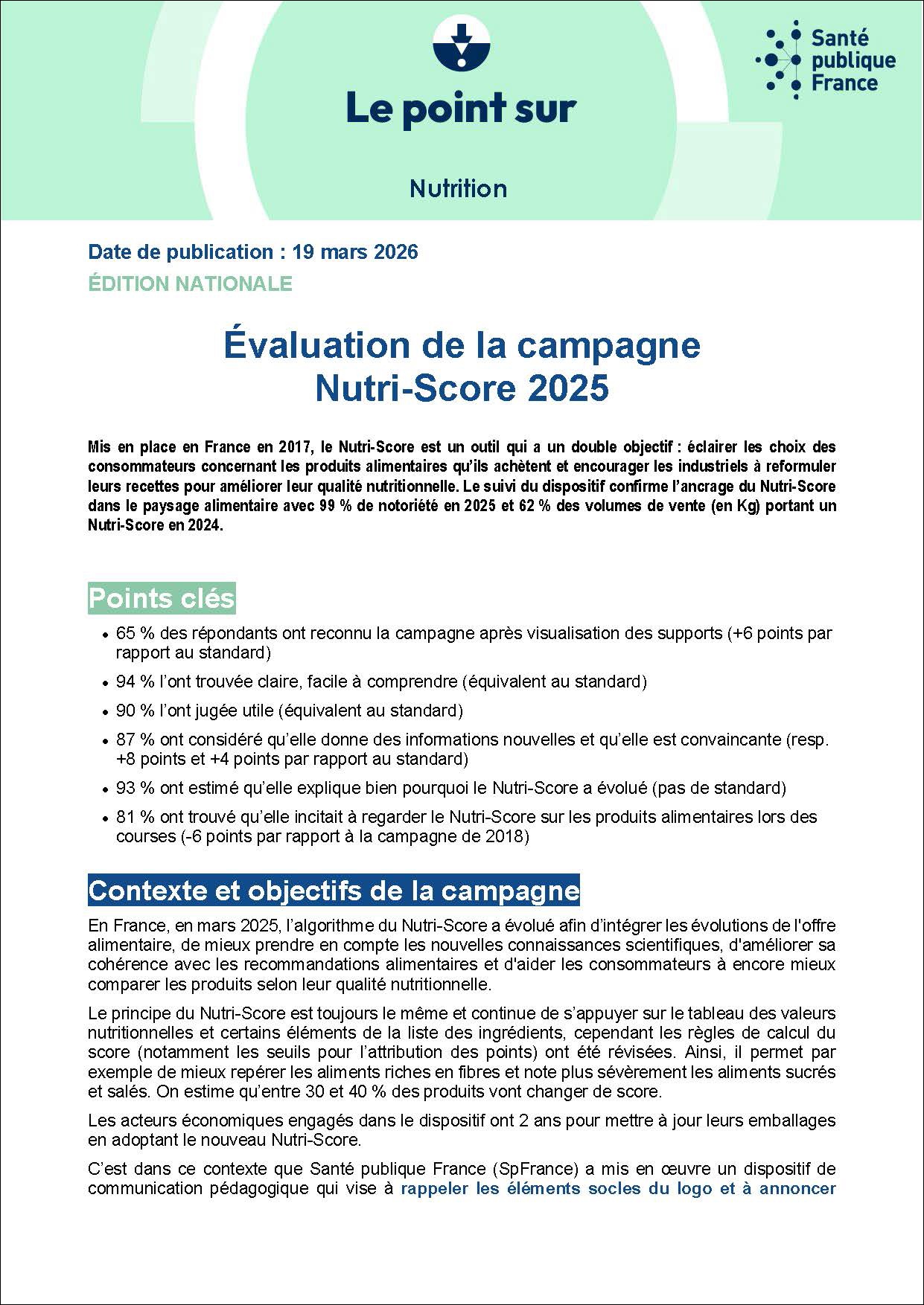 En France, en mars 2025, l'algorithme du Nutri-Score a évolué afin d'intégrer les évolutions de l'offre alimentaire, de mieux prendre en compte les nouvelles connaissances scientifiques, d'améliorer sa cohérence avec les recommandations alimentaires et d'aider les consommateurs à encore mieux comparer les produits selon leur qualité nutritionnelle. Le principe du Nutri-Score est toujours le même et continue de s'appuyer sur le tableau des valeurs nutritionnelles et certains éléments de la liste des ingrédients, cependant les règles de calcul du score (notamment les seuils pour l'attribution des points) ont été révisées. Ainsi, il permet par exemple de mieux repérer les aliments riches en fibres et note plus sévèrement les aliments sucrés et salés. On estime qu'entre 30 et 40 % des produits vont changer de score. Les acteurs économiques engagés dans le dispositif ont 2 ans pour mettre à jour leurs emballages en adoptant le nouveau Nutri-Score. C'est dans ce contexte que Santé publique France (SpFrance) a mis en œuvre un dispositif de communication pédagogique qui vise à rappeler les éléments socles du logo et à annoncer l'évolution du mode de calcul. Afin de définir la stratégie de communication, Santé publique France s'est appuyée sur deux études qualitatives menées auprès des consommateurs : une étude exploratoire menée début 2023 et un prétest du dispositif de communication en novembre 2023.