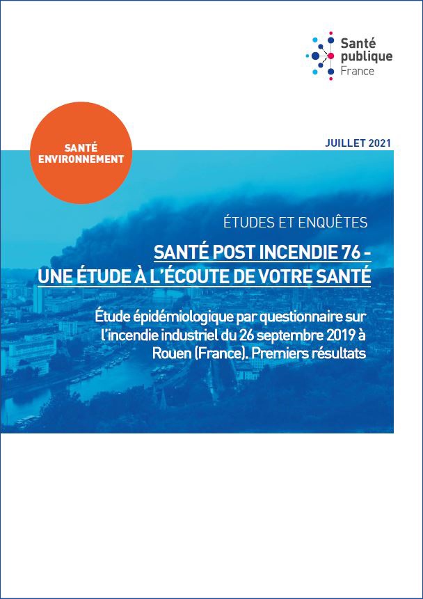 Un incendie industriel de grande ampleur est survenu à Rouen le 26 septembre 2019 sur les sites des entreprises Lubrizol et NL Logistique. Santé publique France a mis en place le dispositif Santé post Incendie 76 pour réaliser une évaluation globale des conséquences de l'accident sur la santé de la population exposée. Ce rapport présente les résultats principaux de l'enquête transversale de ce dispositif dont l'objectif principal était d'étudier l'impact sanitaire de l'accident à court et à moyen termes (un an après). L'étude a été réalisée sur un échantillon représentatif des 340 000 habitants de 122 communes de Seine-Maritime (76) exposées à l'accident. Les données ont été recueillies par questionnaire, en septembre et octobre 2020, auprès de 3 764 adultes et de 1 029 enfants de la zone exposée, et de 1 015 adultes et 208 enfants représentant la population du Havre et de ses environs (zone témoin). Pendant l'incendie et ses suites, une forte proportion (92%) de la population de la zone exposée a perçu au moins une des pollutions accidentelles : bruits, flammes et explosions, fumées noires, substances odorantes, suies et morceaux de toit en fibrociment déposés au sol. La perception d'odeurs, notamment, a pu persister longtemps et être gênante. On observe que 66% des personnes ont rapporté au moins un trouble de santé attribué à l'accident. Il s'agissait principalement de symptômes psychologiques, oto-rhino-laryngologiques (ORL), généraux, oculaires, respiratoires et de troubles du sommeil. Les riverains vivant à proximité du lieu de sinistre ont déclaré plus de symptômes et de problèmes de santé que les habitants plus éloignés. Deux tiers des adultes symptomatiques n'ont pas fait appel au système de soins, les autres ont eu surtout recours à un médecin généraliste ou à l'automédication. Plusieurs expositions perçues (odeurs, fumées noires, dépôts de suies et le fait d'avoir été réveillé, vu ou entendu l'incendie) sont statistiquement liées aux symptômes les plus fréquemment ressentis par les adultes dans les suites de l'accident et au recours aux soins médico-psychologiques. L'association la plus forte est observée avec la perception des odeurs, en particulier sur les troubles ORL et les céphalées, et une relation croissante est mise en évidence entre la durée de l'exposition olfactive et les principaux événements de santé déclarés. Chez les enfants, les troubles de santé ressentis et leurs fréquences, de même que les recours aux soins qui ont été rapportés étaient comparables à ceux des adultes. Un an après, cet événement accidentel a eu un effet négatif sur la santé perçue des habitants de la zone exposée, mesurée par la version en 12 items du Medical Outcomes Study Short Form Health Survey (SF-12), en particulier sur leur santé mentale. Le nombre de nuisances ressenties, la perception d'odeurs, notamment quand elle a été de longue durée, les dépôts de suies autour du domicile et le fait d'avoir vu, entendu ou été réveillé par l'incendie étaient associés à une santé mentale dégradée. Les résultats de cette étude sont cohérents avec les données recueillies au décours de l'accident par d'autres dispositifs, et avec la littérature épidémiologique traitant des effets sur la santé des expositions aux pollutions et nuisances et aux conséquences psychologiques d'événements accidentels similaires. L'incendie industriel du 26 septembre 2019 a eu un effet global sur la santé perçue, mesurable encore un an après, ce qui souligne l'importance de la mise en place d'un suivi prospectif post-accidentel de la santé de la population exposée. Ces observations permettent de faire des premières propositions d'action visant à améliorer la gestion des conséquences de cet incendie sur la santé et la préparation de la réponse à de futurs accidents industriels.