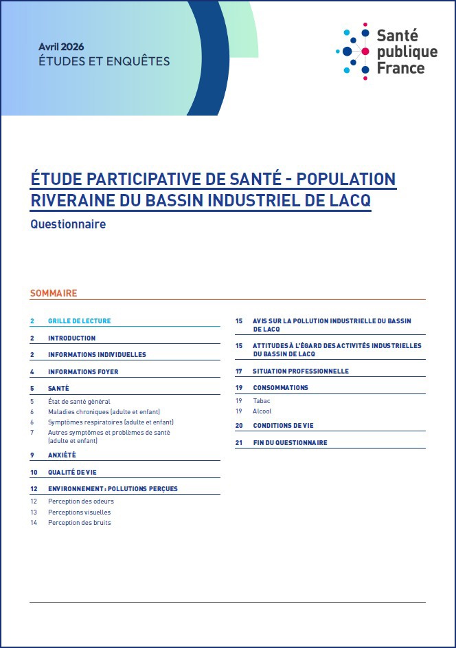 Santé publique France mène une étude épidémiologique sur la santé et la qualité de vie des riverains du bassin industriel de Lacq, en complément des travaux déjà engagés dans cette zone depuis 2016. Le questionnaire d'enquête est présenté dans son intégralité, à l'exception de questions de contrôle non présentées afin de faciliter la lecture. Il reprend les consignes indiquées sur l'écran des enquêteurs ainsi que les conditions des questions