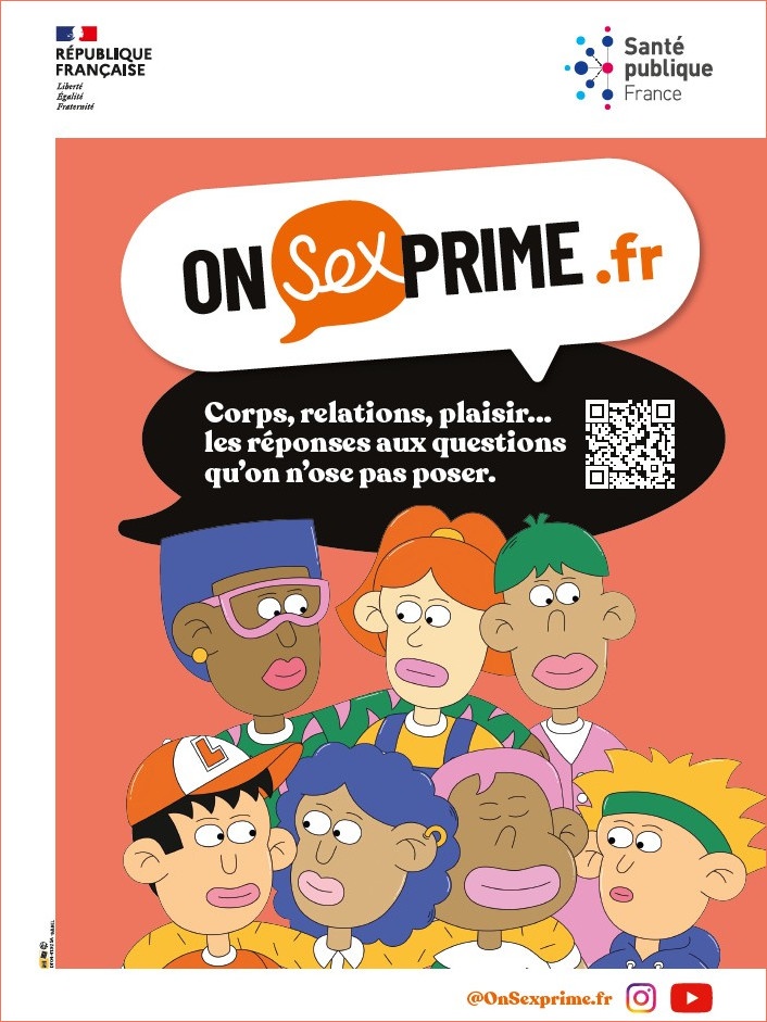 Affiche du dispositif OnSEXprime avec QRcode renvoyant directement sur le site onsexprime.fr. Ce document est à destination des jeunes.