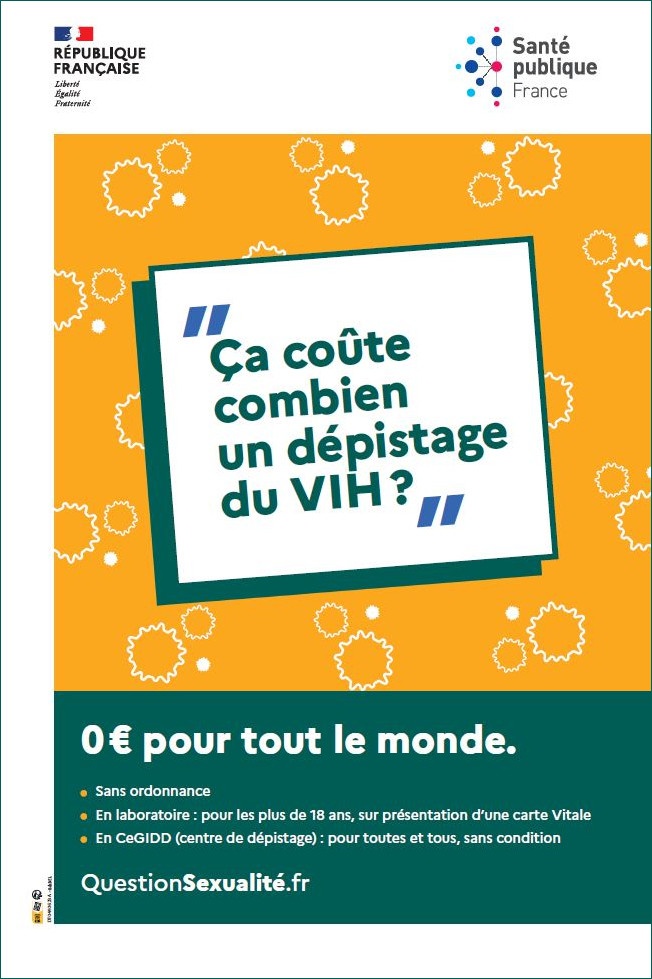 Editée à l'occasion de la semaine de la santé sexuelle 2023, cette affiche précise les conditions de la gratuité du dépistage du VIH. Accroche : "Ça coûte combien un dépistage du VIH ?". Ce document est à destination des adultes.