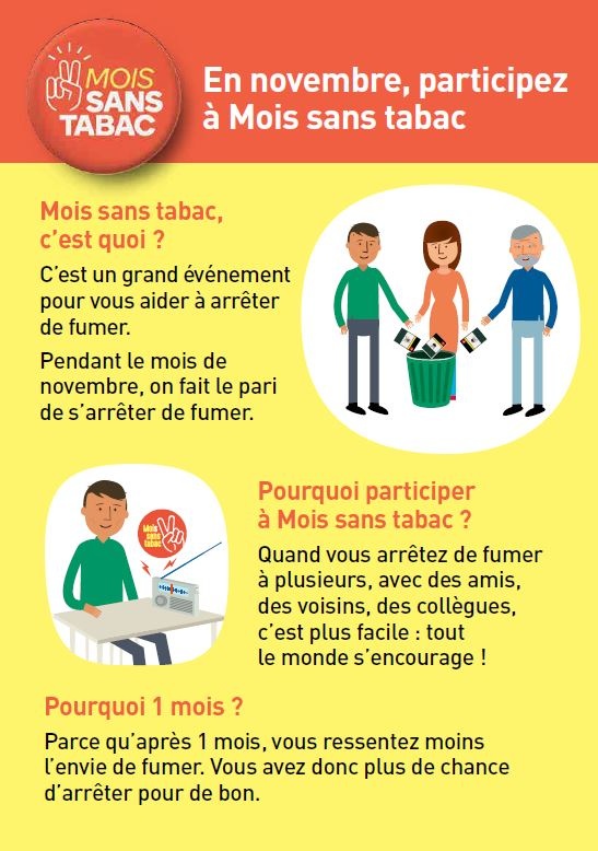 Dépliant d'information de la campagne "Mois sans tabac". Il explique le dispositif, les raisons d'y participer, les modalités d'inscription sur le site de Tabac info service. Ce dépliant est une version accessible pour faciliter la lecture par le plus grand nombre.