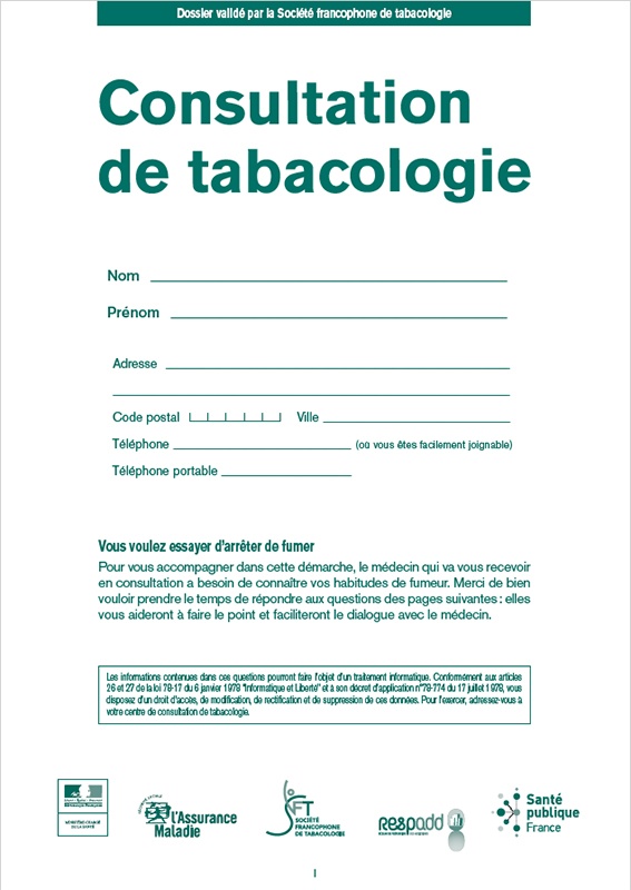 Pochette (format A4) contenant un questionnaire à remplir par le consultant et le médecin, afin d'aider le fumeur à faire le point et de faciliter le dialogue avec le médecin. Il est complété par 2 petits carnets de suivi personnel destinés au consultant et une fiche "Comment vous sentez-vous?" de test de suivi. (Dossier validé par la Société française de tabacologie).