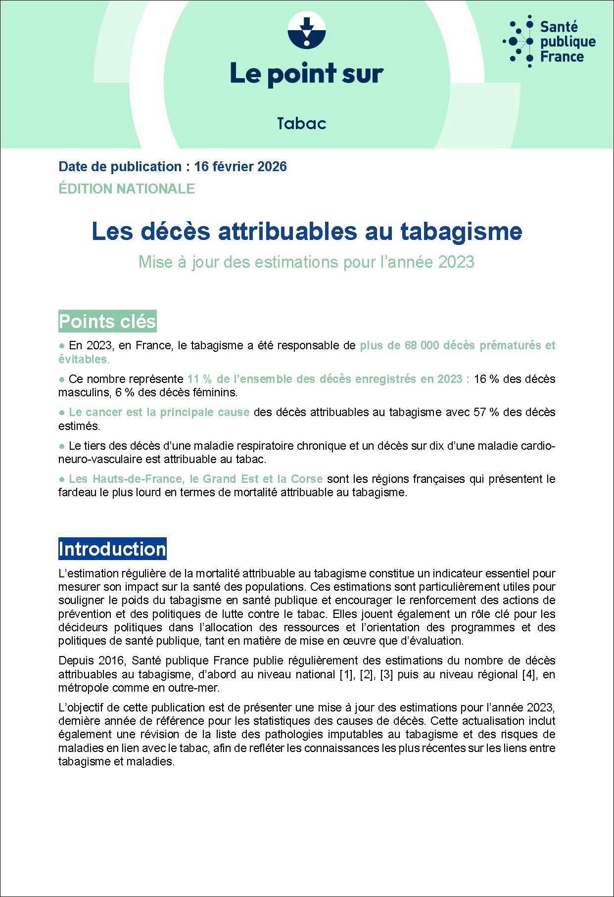 En 2023, en France, le tabagisme a été responsable de plus de 68 000 décès prématurés et évitables. Ce nombre représente 11 % de l'ensemble des décès enregistrés en 2023 : 16 % des décès masculins, 6 % des décès féminins. Le cancer est la principale cause des décès attribuables au tabagisme avec 57 % des décès estimés. Le tiers des décès d'une maladie respiratoire chronique et un décès sur dix d'une maladie cardio-neuro-vasculaire est attribuable au tabac. Les Hauts-de-France, le Grand Est et la Corse sont les régions françaises qui présentent le fardeau le plus lourd en termes de mortalité attribuable au tabagisme.