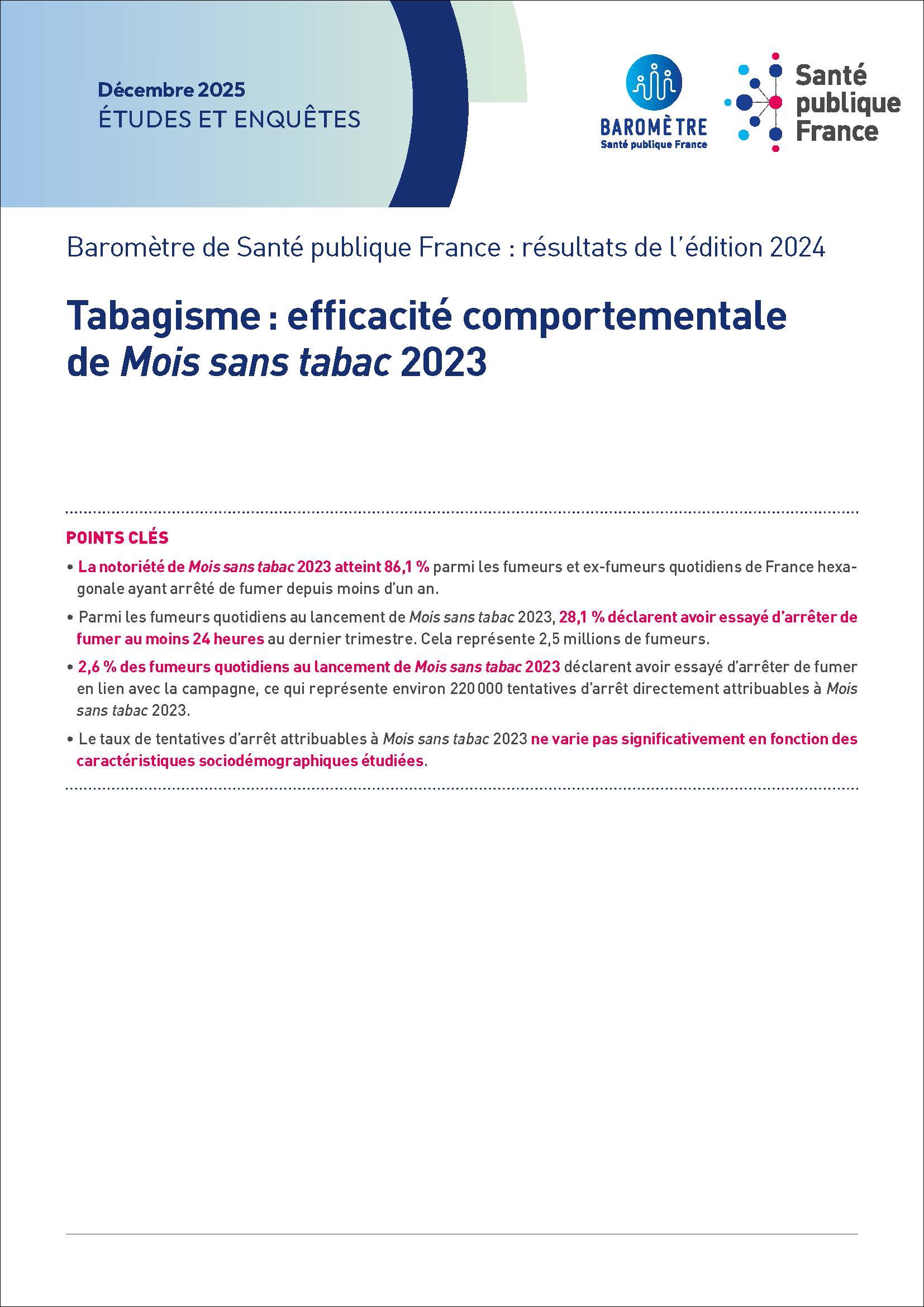 La notoriété de Mois sans tabac 2023 atteint 86,1 % parmi les fumeurs et ex-fumeurs quotidiens de France hexa-gonale ayant arrêté de fumer depuis moins d'un an. Parmi les fumeurs quotidiens au lancement de Mois sans tabac 2023, 28,1 % déclarent avoir essayé d'arrêter de fumer au moins 24 heures au dernier trimestre. Cela représente 2,5 millions de fumeurs. 2,6 % des fumeurs quotidiens au lancement de Mois sans tabac 2023 déclarent avoir essayé d'arrêter de fumer en lien avec la campagne, ce qui représente environ 220 000 tentatives d'arrêt directement attribuables à Mois sans tabac 2023. Le taux de tentatives d'arrêt attribuables à Mois sans tabac 2023 ne varie pas significativement en fonction des caractéristiques sociodémographiques étudiées.