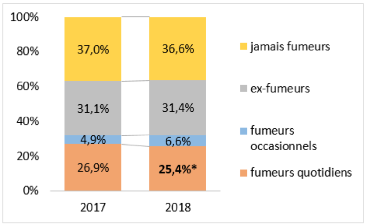 - Pasquereau A, Andler R, Guignard R, et al. La consommation de tabac en France en 2017 : premiers résultats issus du Baromètre santé 2017. Bull Epidemiol Hebd. 2018;14-15:265-73.