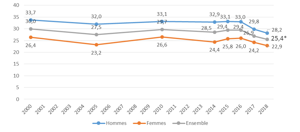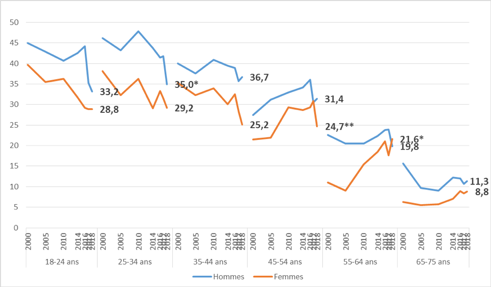 - parmi les 18-44 ans : le tabagisme est en baisse entre 2000 et 2019. La prévalence se stabilise entre 2019 et 2021, excepté parmi les hommes de 18-24 ans parmi lesquels une baisse est observée ;