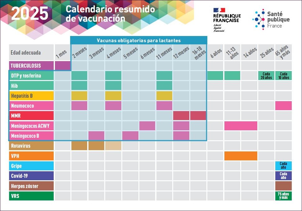 Carte postale, en espagnol, du calendrier simplifié des vaccinations 2025. Elle présente les vaccins recommandés à chaque personne tout au long de sa vie et selon sa situation. Elle récapitule, en fonction de l'âge, les vaccins nécessaires pour acquérir une immunité de base et donne des conseils sur les rappels et les retards éventuels dans le programme de vaccination.