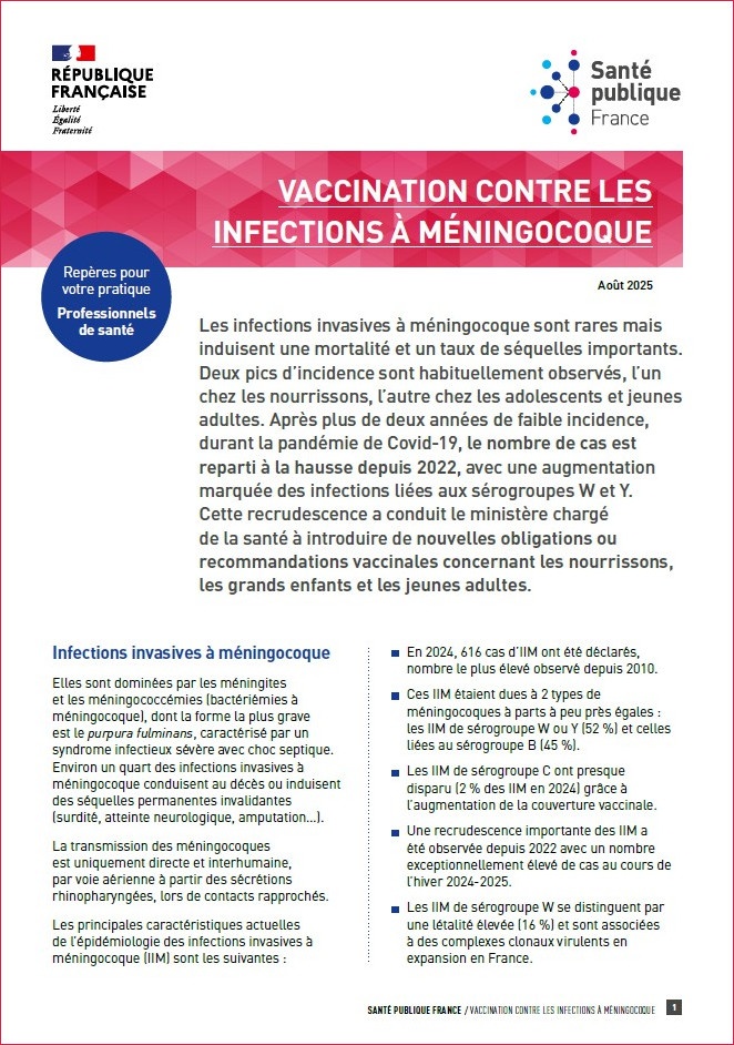 Ce document destiné aux professionnels de santé permet de faire un point sur les principales caractéristiques actuelles de l'épidémiologie des infections invasives à méningocoque, les recommandations vaccinales et la vaccination en pratique.