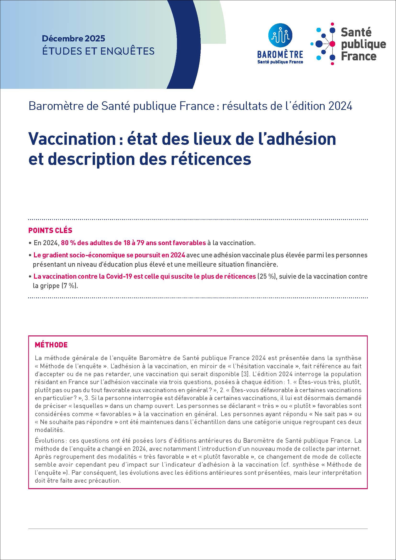 En 2024, 80 % des adultes de 18 à 79 ans sont favorables à la vaccination. Le gradient socio-économique se poursuit en 2024 avec une adhésion vaccinale plus élevée parmi les personnes présentant un niveau d'éducation plus élevé et une meilleure situation financière. La vaccination contre la Covid-19 est celle qui suscite le plus de réticences (25 %), suivie de la vaccination contre la grippe (7 %).