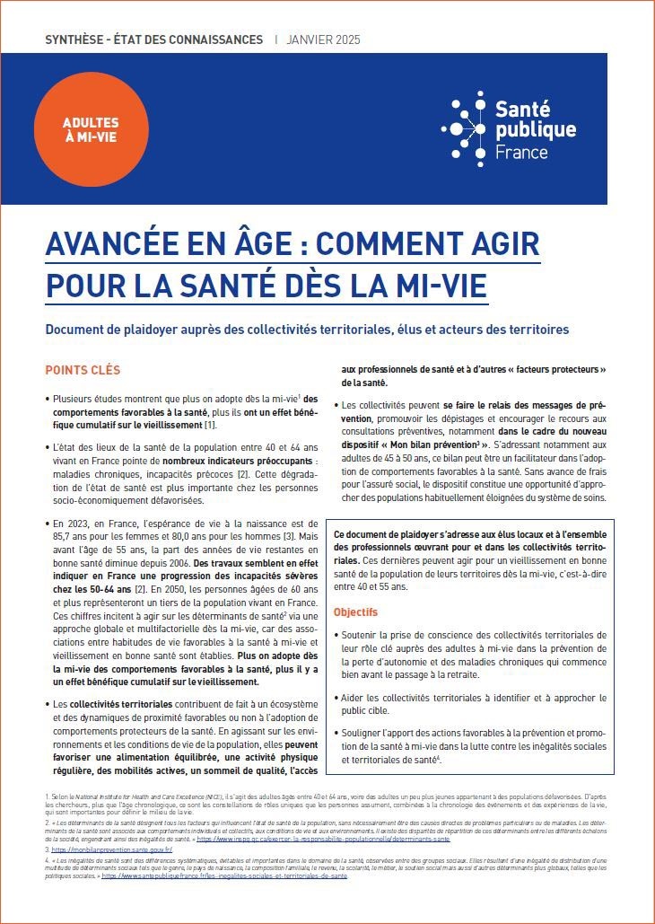 Ce document de plaidoyer s'adresse aux élus locaux et à l'ensemble des professionnels œuvrant pour et dans les collectivités territoriales. Ces dernières peuvent agir pour un vieillissement en bonne santé de la population de leurs territoires dès la mi-vie, c'est-à-dire entre 40 et 55 ans. Ses objectifs sont de soutenir la prise de conscience des collectivités territoriales de leur rôle clé auprès des adultes à mi-vie dans la prévention de la perte d'autonomie et des maladies chroniques qui commence bien avant le passage à la retraite ; d'aider à l'identification et à l'approche du public cible et de souligner l'apport des actions favorables à la prévention et promotion de la santé à mi-vie dans la lutte contre les inégalités sociales et territoriales de santé. Le plaidoyer fait ressortir les points clés suivants : Plusieurs études montrent que plus on adopte dès la mi-vie des comportements favorables à la santé, plus ils ont un effet bénéfique cumulatif sur le vieillissement ; L'état des lieux de la santé de la population entre 40 et 64 ans vivant en France pointe de nombreux indicateurs préoccupants : maladies chroniques, incapacités précoces. Cette dégradation de l'état de santé est plus importante chez les personnes socio-économiquement défavorisées ; En 2023, en France, l'espérance de vie à la naissance est de 85,7 ans pour les femmes et 80,0 ans pour les hommes. Mais avant l'âge de 55 ans, la part des années de vie restantes en bonne santé diminue depuis 2006. Des travaux semblent en effet indiquer en France une progression des incapacités sévères chez les 50-64 ans. En 2050, les personnes âgées de 60 ans et plus représenteront un tiers de la population vivant en France. Ces chiffres incitent à agir sur les déterminants de santé via une approche globale et multifactorielle dès la mi-vie, car des associations entre habitudes de vie favorables à la santé à mi-vie et vieillissement en bonne santé sont établies. Plus on adopte dès la mi-vie des comportements favorables à la santé, plus il y a un effet bénéfique cumulatif sur le vieillissement ; Les collectivités territoriales contribuent de fait à un écosystème et des dynamiques de proximité favorables ou non à l'adoption de comportements protecteurs de la santé. En agissant sur les environnements et les conditions de vie de la population, elles peuvent favoriser une alimentation équilibrée, une activité physique régulière, des mobilités actives, un sommeil de qualité, l'accès aux professionnels de santé et à d'autres " facteurs protecteurs " de la santé ; Les collectivités peuvent se faire le relais des messages de prévention, promouvoir les dépistages et encourager le recours aux consultations préventives, notamment dans le cadre du nouveau dispositif "Mon bilan prévention". S'adressant notamment aux adultes de 45 à 50 ans, ce bilan peut être un facilitateur dans l'adoption de comportements favorables à la santé. Sans avance de frais pour l'assuré social, le dispositif constitue une opportunité d'approcher des populations habituellement éloignées du système de soins.