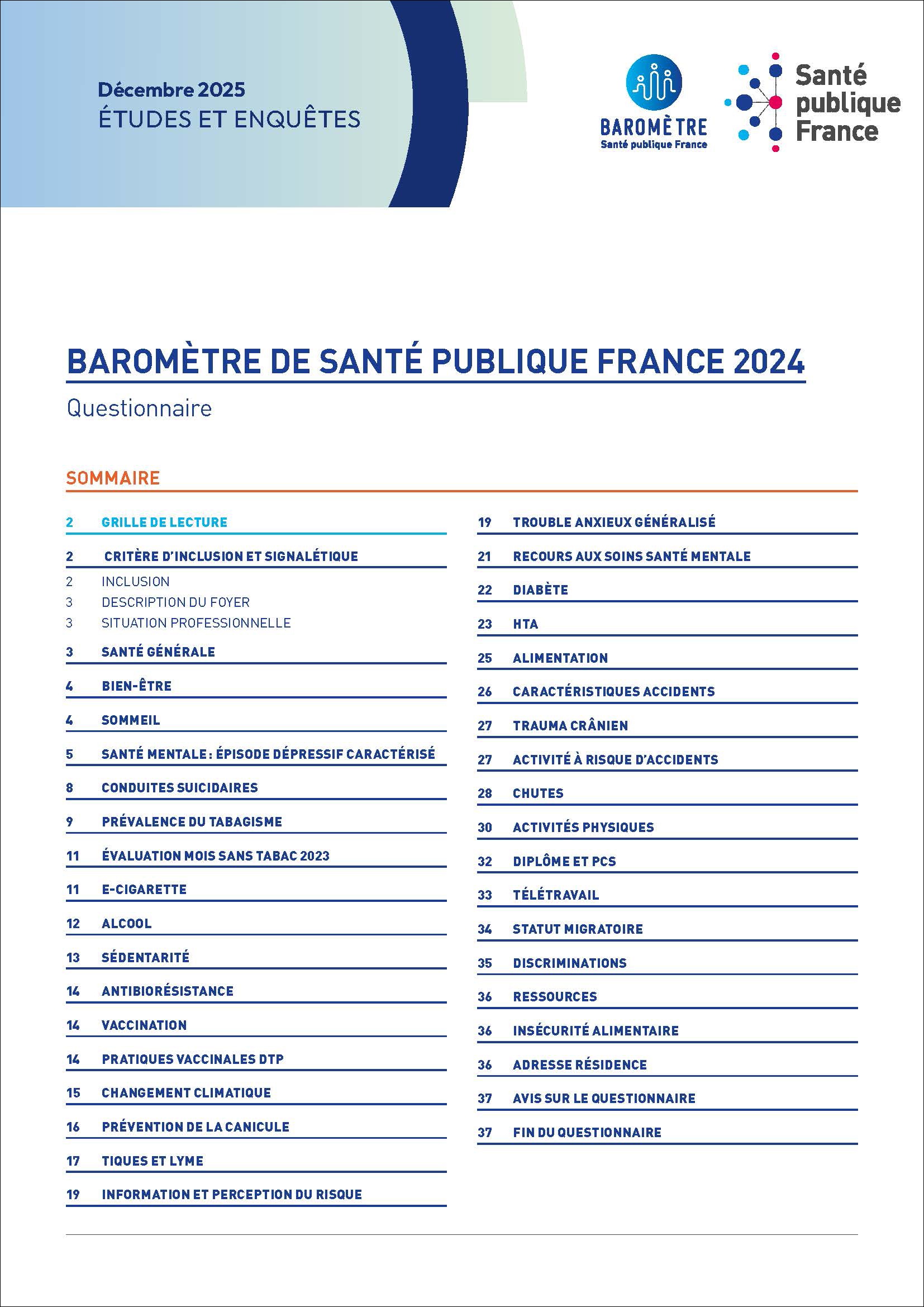 Le questionnaire du Baromètre de Santé publique France 2024 est un questionnaire auto-administré par Internet (CAWI) et hétéro-administré par téléphone (CATI). Une phase contact était prévue pour vérifier si la personne répondante était bien la personne tirée au sort et si la personne était bien dans le champ d'âge de l'enquête (18-79 ans). Il est présenté dans son intégralité : il reprend les consignes indiquées à l'écran ainsi que les conditions des questions.