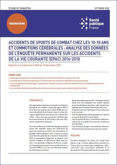 Certaines disciplines de sports de combat (kick boxing, muay et autres apparentées) autorisent en France, chez les mineurs, des combats avec " KO ", c'est-à-dire avec commotions cérébrales. À la demande de la Direction générale de la santé, Santé publique France a réalisé une étude épidémiologique afin de décrire, chez les enfants âgés de 10 à 18 ans, les accidents survenant lors de la pratique de sports de combat et la fréquence des commotions cérébrales survenues lors de cette pratique sportive. Les accidents impliquant un sport de combat ont été décrits à partir des données de l'Enquête permanente sur les accidents de la vie courante (EPAC) sur la période 2016-2018. Cette enquête repose sur l'enregistrement exhaustif des recours aux urgences pour accident de la vie courante (AcVC) dans dix hôpitaux en France.