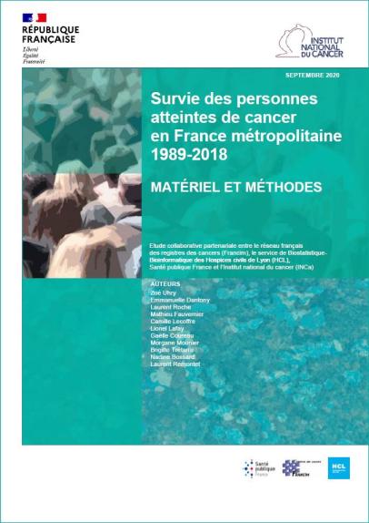 La présente étude porte sur le suivi des personnes après un cancer diagnostiqué entre 1989 et 2015, âgées de 15 ou plus au moment diagnostic et résidant dans un des départements métropolitains couverts par un registre (19 à 22 départements selon le cancer étudié). Le statut vital des personnes incluses a été mis à jour au 30 juin 2018 par les registres selon une procédure standardisée. Comme dans la précédente étude [1], les résultats sont structurés en 3 parties : Partie 1 : Survie à 1 et 5 ans des personnes diagnostiquées entre 2010 et 2015 (tous registres) ; Partie 2 : Tendances de la survie nette à 1, 5 et 10 ans des personnes diagnostiquées entre 1990 et 2015 (restriction aux registres couvrant l'ensemble de la période 1990-2015, Hommes et Femmes ensemble) ; Partie 3 : Survie nette à long terme (20 ans) des personnes diagnostiquées entre 1989 et 2000 et âgées de moins de 75 ans. À noter que certaines hémopathies malignes ne sont analysables que depuis 1995 ou 2003 (cf. Table 7 en section 1.6) : pour ces hémopathies, les tendances en partie 2 portent donc sur la période 1995-2015 ou 2003-2015 respectivement et la partie 3 n'est pas présentée. En termes de méthode, cette nouvelle édition utilise une approche basée sur la modélisation du taux de mortalité en excès pour estimer la survie nette. Les modèles utilisés reposent sur des splines multidimensionnelles pénalisées; ces modèles ont été développés au sein du service de Biostatistique Bioinformatique des HCL [4-5].À noter que l'étude des tendances nationales de l'incidence et de la mortalité utilisait aussi des splines multidimensionnelles pénalisées, mais dans le cadre de modèles de Poisson [6-7].
