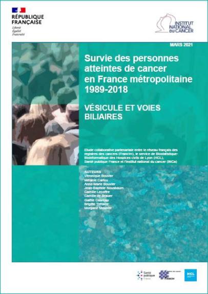 En France, pour l'année 2018, le nombre estimé de nouveaux cas de cancer de la vésicule ou des voies biliaires était de 2 965 dont 1 533 chez les hommes et 1 432 chez les femmes. À retenir : Survie nette standardisée à 5 ans de 22 % chez l'homme et la femme pour les cas diagnostiqués entre 2010 et 2015 ; Amélioration de 18 points de pourcentage de la survie nette standardisée à 1 an entre 1990 et 2015 (38 % en 1990 et 56 % en 2015) ; Amélioration de la survie nette à 5 et 10 ans seulement pour les personnes âgées de moins de 80 ans ; Stabilisation de la mortalité en excès à un taux très faible après 10 ans de suivi.
