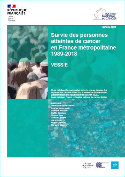 En France, le nombre de nouveaux cas de cancers infiltrants de la vessie estimé en 2018 était de 13 074, dont 81 % sont survenus chez les hommes. Le nombre estimé de décès par cancer de la vessie en 2018 était de 5 335, dont 77 % chez les hommes. À retenir : Survie nette standardisée à 5 ans de 55 % chez l'homme et 49 % chez la femme entre 2010 et 2015 ; Survie moins bonne pour les femmes comparé à celle des hommes, observée pour tous les âges, et liée à une mortalité en excès juste après le diagnostic plus élevée ; Diminution de la survie entre 1990 et 2015, plus importante chez les personnes jeunes, probablement artéfactuelle, en raison de l'évolution du codage et de l'enregistrement des cas.