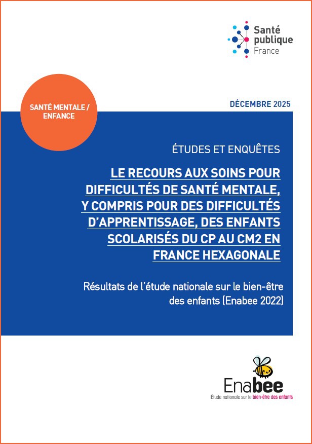 Contexte et objectifs; La santé mentale des enfants constitue un enjeu majeur de santé publique, tant en raison de ses répercussions individuelles que de ses implications sociétales. Différentes études épidémiologiques internationales soulignent qu'une part importante des enfants n'ont pas accès aux soins en santé mentale. En France, il n'existe pas de données estimant le recours aux soins en santé mentale des enfants de 6 à 11 ans. Les objectifs de ce rapport sont : 1/ d'estimer la fréquence du recours aux soins pour difficultés de santé mentale, y compris pour des difficultés d'apprentissage, parmi les enfants scolarisés du CP au CM2 en France hexagonale, 2/ d'identifier les facteurs associés à ce recours. Matériels et méthodes; Les données sont issues de l'étude Enabee, une étude transversale nationale menée dans des écoles françaises au printemps 2022 dans l'Hexagone, basée sur un échantillonnage aléatoire et représentatif de la population des enfants scolarisés de la petite section de maternelle au CM2 en école publique ou privée sous contrat avec l'Éducation nationale. Pour chaque enfant, un parent, un enseignant et l'enfant lui-même ont répondu à des auto-questionnaires. Les enfants ont évalué leur santé mentale en complétant le Dominique Interactif, un questionnaire informatisé, audiovisuel, qui explore les symptômes des principaux troubles de santé mentale. Les enseignants et les parents ont rempli le Strengths and Difficulties Questionnaire, qui repère les symptômes émotionnels, d'opposition et d'inattention/hyperactivité chez les enfants. Les parents ont aussi répondu à des questions concernant leur santé et leur statut socio-économique, mais aussi leur famille et le milieu de vie de leur enfant. Le recours aux soins en lien avec la santé mentale a été évalué en demandant au parent si " Depuis un an, [son enfant] a été vu par un ou des professionnels pour des difficultés psychologiques ou d'apprentissage " et en précisant les types de professionnels consultés. Une régression logistique multinomiale a été réalisée afin d'étudier les facteurs associés i/ au recours à un professionnel de la rééducation, ii/ au recours au psychologue ou au psychiatre et iii/ au recours à un professionnel de la rééducation et au psychologue ou au psychiatre. La sélection des variables reposait sur le modèle théorique d'Andersen, postulant que le recours aux soins est influencé par des facteurs prédisposants, des facteurs facilitants et des facteurs de besoins. Résultats; Nos résultats soulignaient un accompagnement fréquent des enfants pour des difficultés psychologiques ou d'apprentissage puisque 21,3 % [20,2-22,4] de l'ensemble des enfants inclus avaient consulté un professionnel en raison de ces difficultés au cours de l'année précédant l'enquête. Ce recours aux soins ne concernait que 52,8 % [49,3-56,2] des enfants qui avaient été identifiés par les échelles psychométriques comme ayant un trouble probable de santé mentale. La proportion d'enfants ayant eu recours aux soins était plus importante parmi ceux présentant un trouble oppositionnel probable ou un trouble de déficit de l'attention avec ou sans hyperactivité probable que parmi ceux présentant uniquement un trouble émotionnel probable (58,1 % [53,6-62,4] versus 44,7 % [39,6-49,9]). L'analyse des facteurs associés au recours aux soins montrait en particulier qu'un haut niveau de diplôme du parent ou que les parents soient séparés était associé à un recours accru au psychologue ou au psychiatre, et qu'à l'opposé, le fait qu'un ou les deux parents soient nés à l'étranger était associé à un moindre recours aux soins. Les résultats illustrent le rôle de pivot des médecins généralistes et des pédiatres dans l'accès aux intervenants de la santé mentale et de la rééducation. Enfin, on notait une association forte entre les facteurs de besoins en santé mentale (troubles de santé mentale et difficultés scolaires) et le recours aux soins. Discussion; Ces données d'Enabee 2022 permettent de documenter pour la première fois en France, le recours aux soins pour difficultés de santé mentale, y compris d'apprentissage, des enfants de 6 à 11 ans. Nos résultats révèlent un recours fréquent pour ces difficultés auprès de spécialistes de la santé mentale et de la rééducation. Cependant nos résultats soulignent qu'environ la moitié des enfants que l'étude a identifiée comme ayant des difficultés de santé mentale n'ont pas eu recours aux soins et que ce recours est inégalitaire socialement. Nos résultats plaident pour une nécessaire amélioration de l'accès à la prise en soins de la santé mentale des enfants de 6-11 ans.