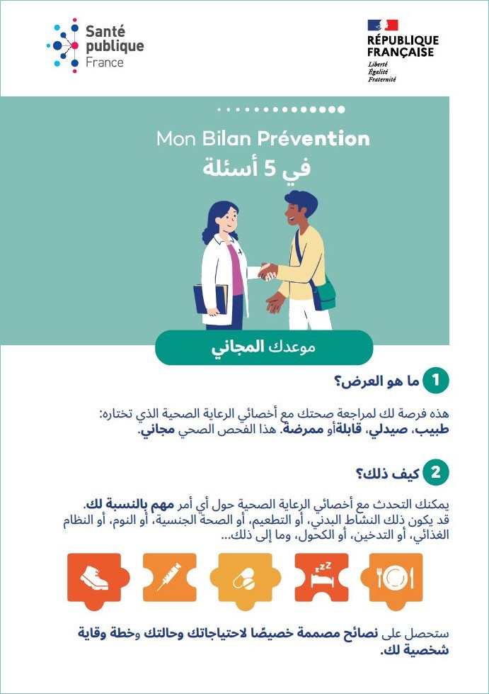 Ce flyer en arabe prenant en compte la littératie en santé et conçu pour être accessible à tous et toutes présente le dispositif "Mon bilan prévention". celui-ci permet de faire gratuitement le point sur sa santé à des âges clefs afin d'obtenir des conseils de prévention adaptés. Co-construit avec des professionnels et des associations, ce flyer est remis aux personnes concernées par les acteurs menant des actions d'" aller vers " auprès des personnes en situation de vulnérabilité.