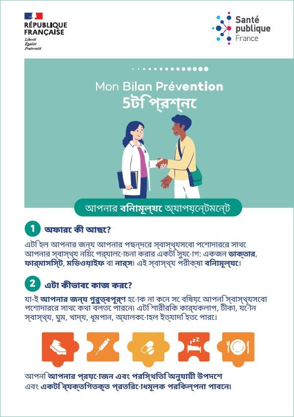 Ce flyer en bengali prenant en compte la littératie en santé et conçu pour être accessible à tous et toutes présente le dispositif "Mon bilan prévention". celui-ci permet de faire gratuitement le point sur sa santé à des âges clefs afin d'obtenir des conseils de prévention adaptés. Co-construit avec des professionnels et des associations, ce flyer est remis aux personnes concernées par les acteurs menant des actions d'" aller vers " auprès des personnes en situation de vulnérabilité.