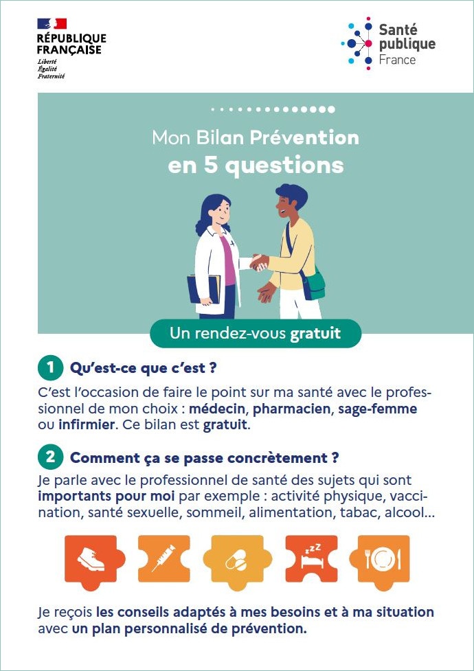 Ce flyer prenant en compte la littératie en santé et conçu pour être accessible à tous et toutes présente le dispositif "Mon bilan prévention". celui-ci permet de faire gratuitement le point sur sa santé à des âges clefs afin d'obtenir des conseils de prévention adaptés. Co-construit avec des professionnels et des associations, ce flyer est remis aux personnes concernées par les acteurs menant des actions d'" aller vers " auprès des personnes en situation de vulnérabilité.