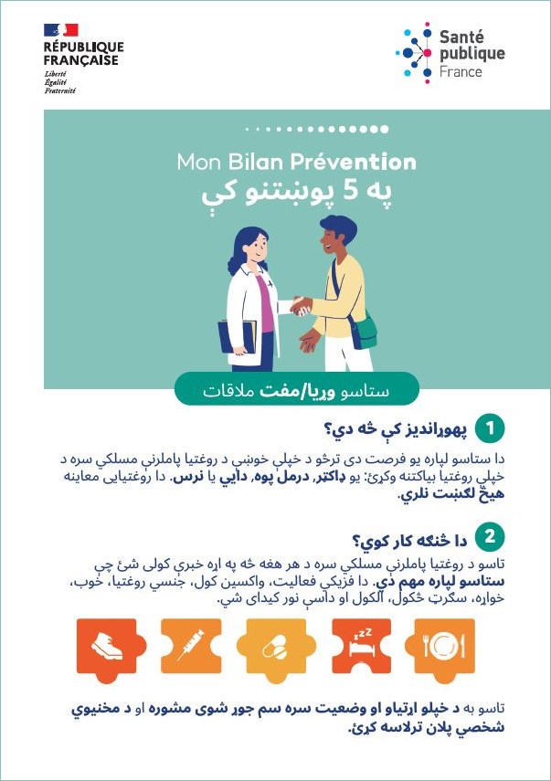 Ce flyer en pashto prenant en compte la littératie en santé et conçu pour être accessible à tous et toutes présente le dispositif "Mon bilan prévention". celui-ci permet de faire gratuitement le point sur sa santé à des âges clefs afin d'obtenir des conseils de prévention adaptés. Co-construit avec des professionnels et des associations, ce flyer est remis aux personnes concernées par les acteurs menant des actions d'" aller vers " auprès des personnes en situation de vulnérabilité.