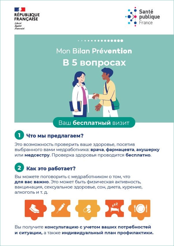 Ce flyer en russe prenant en compte la littératie en santé et conçu pour être accessible à tous et toutes présente le dispositif "Mon bilan prévention". celui-ci permet de faire gratuitement le point sur sa santé à des âges clefs afin d'obtenir des conseils de prévention adaptés. Co-construit avec des professionnels et des associations, ce flyer est remis aux personnes concernées par les acteurs menant des actions d'" aller vers " auprès des personnes en situation de vulnérabilité.