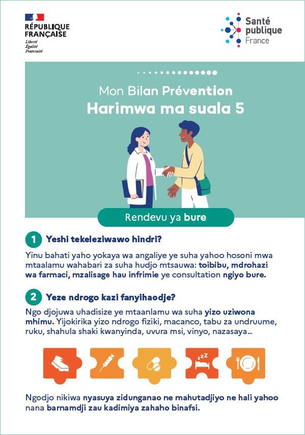 Ce flyer en shingazidja prenant en compte la littératie en santé et conçu pour être accessible à tous et toutes présente le dispositif "Mon bilan prévention". celui-ci permet de faire gratuitement le point sur sa santé à des âges clefs afin d'obtenir des conseils de prévention adaptés. Co-construit avec des professionnels et des associations, ce flyer est remis aux personnes concernées par les acteurs menant des actions d'" aller vers " auprès des personnes en situation de vulnérabilité.
