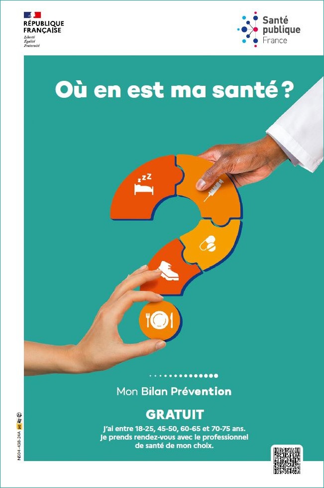 Cette affiche est destinée à promouvoir le dispositif "Mon bilan prévention" en particulier auprès des publics en situation de vulnérabilité. Elle peut être affichée dans les lieux d'accueil, d'hébergement, les salles d'attentes.
