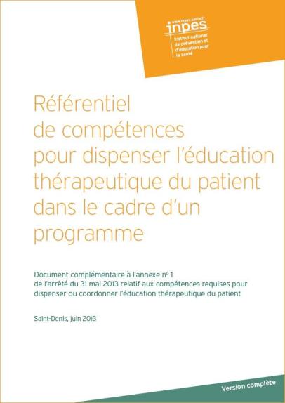 Ce document accompagne l'utilisation du référentiel de compétences définis par voie réglementaire (annexe n°1 de l'arrêté du 31 mai 2013 relatif aux compétences requises pour dispenser et coordonner l'éducation thérapeutique). Il résulte des travaux conduits par l'Inpes avec l'appui d'un groupe d'experts français et internationaux réunis pour élaborer les référentiels. Cette démarche s'est appuyée sur une large consultation. Il a vocation à expliciter le référentiel en proposant une version plus détaillée, comportant différentes rubriques et des illustrations, de façon à permettre son appropriation et à faciliter son utilisation par les différents utilisateurs concernés (professionnels, associations, organismes de formation, administrations, etc.). Un autre document accompagne le référentiel de compétences requises pour coordonner l'éducation thérapeutique.