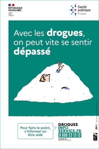Affiche illustrée au format 40x60 cm faisant la promotion du dispositif d'aide à distance en santé Drogues info service. Accroche : "Avec les drogues, on peut vite se sentir dépassé".