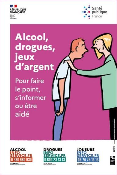 Illustrated poster (40x60 cm) promoting remote support services for addiction-related health issues. Tagline: "Alcohol, drugs, gambling: To assess your situation, get information, or seek help." Contact information for Alcool Info Service, Drogues Info Service, and Joueurs Info Service.