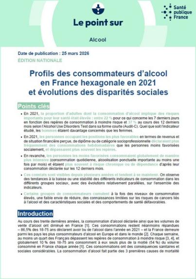 In 2021, the proportion of adults whose alcohol consumption posed significant health risks was high: ranging from 22% over the past 7 days based on low-risk drinking guidelines to 37% over the past 12 months according to the Alcohol Use Disorders Identification Test (AUDIT-C). Regardless of the indicator examined, men were more affected than women. In 2021, individuals in the most advantaged positions in terms of income and perceived financial situation, educational attainment, or socio-professional category reported weekly drinking more frequently than those who were socially disadvantaged, and were more likely to exceed the guidelines. ; Conversely, the least advantaged individuals consumed alcohol more intensively overall (daily consumption, significant binge drinking at least once a month) and were more often at risk of chronic alcohol use or dependence based on their reported consumption over the past 12 months.; These findings have been evident for several years and tend to persist. We observe downward trends or stability in the various consumption indicators across different social groups, with relatively parallel trends across all indicators. ; Certain groups of consumers exhibit a combination of high consumption levels, a low desire to reduce consumption, limited knowledge of alcohol-related cancer risks, and unfavorable social characteristics and health behaviors.