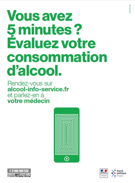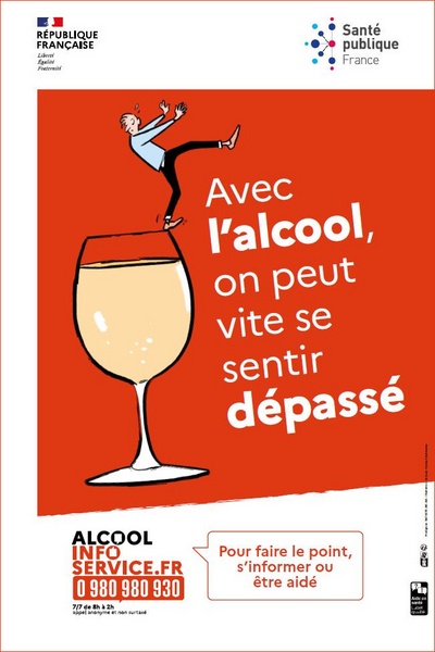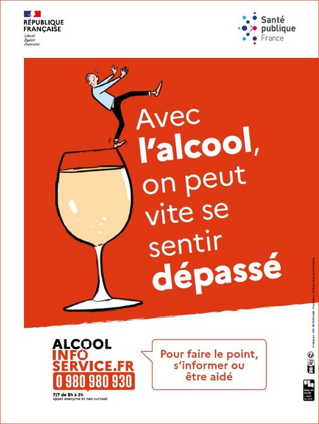 Illustrated poster (30x40 cm) promoting the "Alcool info service" remote health support program. Tagline: "Alcohol can quickly make you feel overwhelmed."