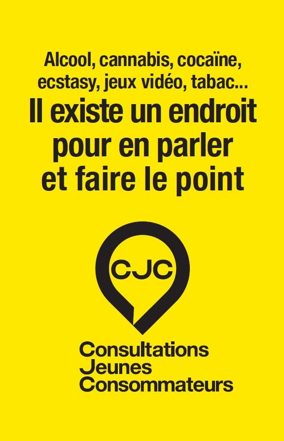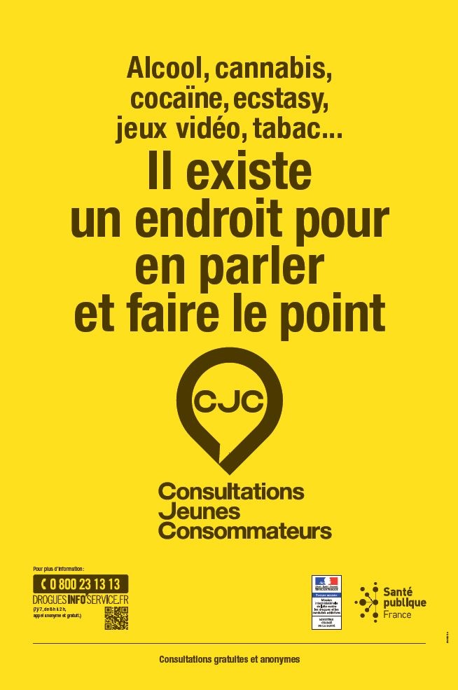 Promotional poster for CJC (Youth Consumer Counseling). It directs people to the Drogues Info Service hotline at 0 800 23 13 13 and the corresponding website.