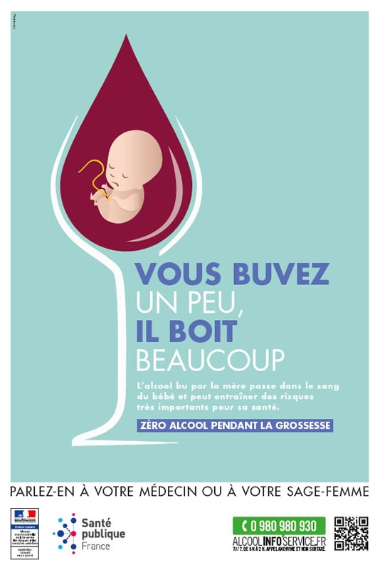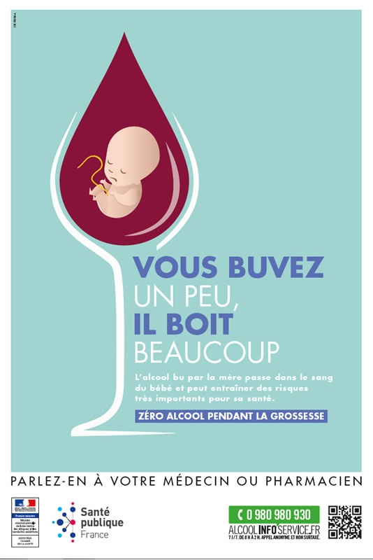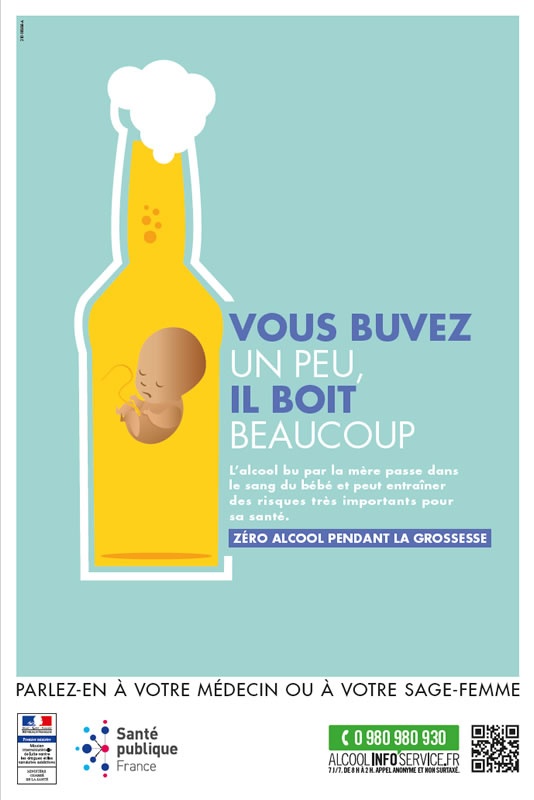 A poster addressing alcohol consumption during pregnancy. It directs viewers to healthcare professionals (doctors or midwives) or to alcool-info-service.fr and its helpline at 0 980 980 930 for...