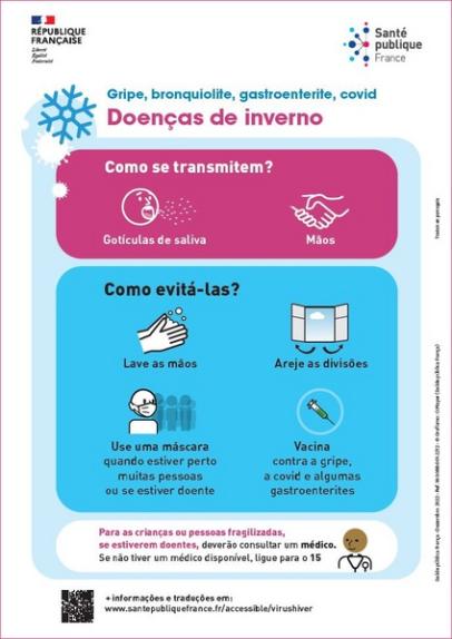 Many viruses circulate during the winter, such as bronchiolitis, gastroenteritis, the flu, and COVID-19. This informational poster on winter illnesses, created collaboratively by professionals who work with people in precarious or vulnerable situations, has been translated into Portuguese and explains how these viruses are transmitted and how to avoid them.
