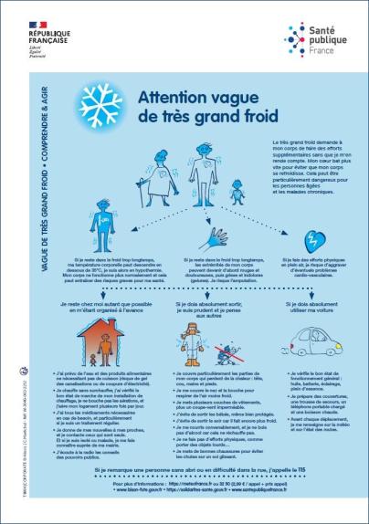 This poster, which can be used by all types of healthcare professionals, organizations, city halls, and any public venue, is designed to inform the general public about the risks associated with extreme cold and suggests best practices for coping with periods of exceptional weather conditions.