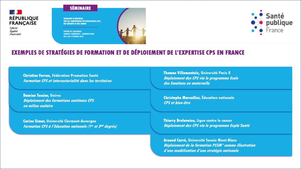 This presentation was given during a roundtable discussion at the seminar on psychosocial skills (PSS) organized by Santé publique France from February 3 to 5, 2025, in Aubervilliers. It presents examples of training and the deployment of PSK expertise in France by seven pilot project leaders and PSK experts, as well as lessons learned from the training and deployment strategy already implemented: Christine Ferron, Fédération Promotion Santé: PSK Training and Intersectorality in Local Communities; Damien Tessier, Unires: Deployment of CPS continuing education in schools; Carine Simar, Clermont-Auvergne University: CPS training in the National Education System (primary and secondary levels); Thomas Villemonteix, Paris 8 University: Deployment of CPS through the “School of Emotions” program in preschool; Christophe Marsollier, French Ministry of Education: CPS and well-being; Thierry Brulavoine, Ligue contre le cancer: Rollout of CPS through the Explo'Santé program; Arnaud Carré, University of Savoie Mont-Blanc: Rollout of PSSM (First Aid in Mental Health) training as an illustration of a model for implementing a national strategy.